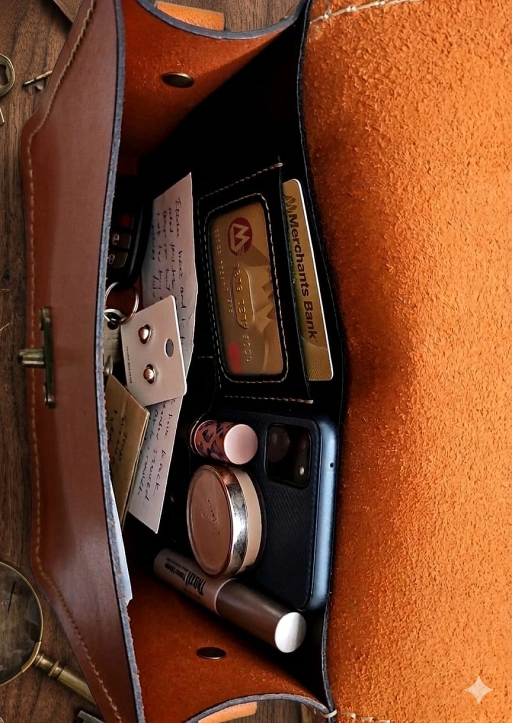 *Vintage Pirinç Detaylar: Çantanın ön yüzündeki nostaljik kilit mekanizması ve metal aksamlar, antik bronz görünümüyle taba rengine mükemmel uyum sağlar.
