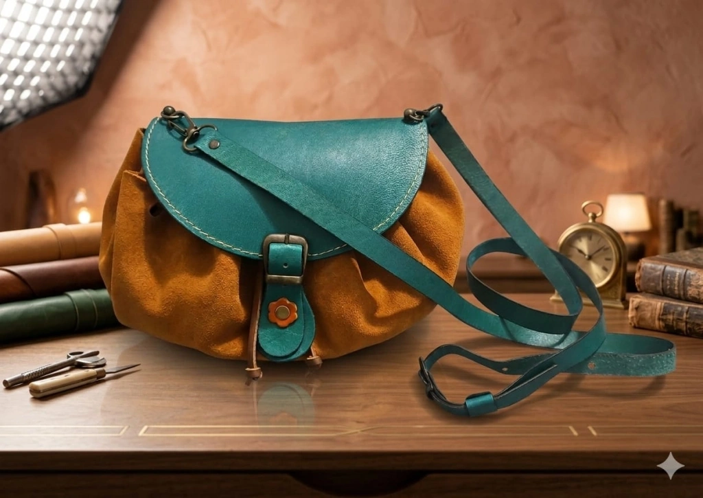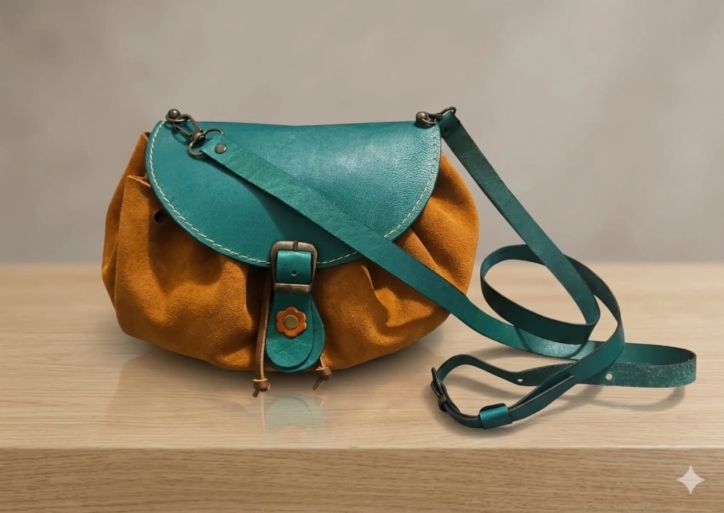 Hakiki Deri El İşçiliği Orta El Çantası / Cüzdan - Turkuaz ve Taba